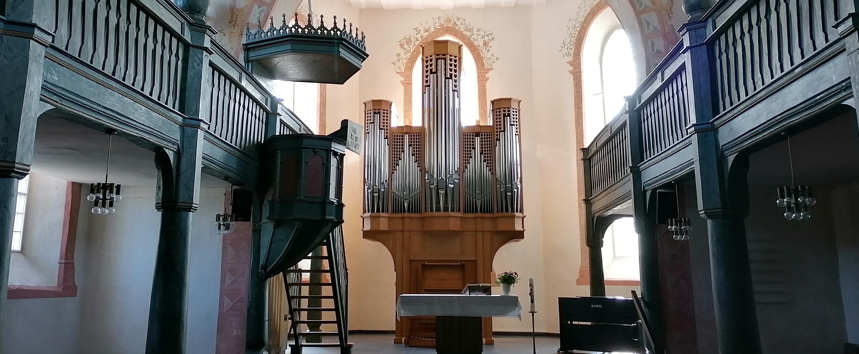1862 wurde, da man mehr Sitzplätze benötigte, das Innere der Kirche umgestaltet: Die Orgel wurde abgerissen und an der Turmseite eine zusätzliche Empore errichtet („dritter Stock“). Im Chorraum fiel der Herrenstuhl weg, die beiden Seiten der Galerie wurden durch eine Chorraumempore verbunden und darauf die Orgel gestellt. Damals oder schon früher wurde das Innere ganz in Weiß gestrichen. 1962/63, anlässlich des Einbaus einer Warmluftheizung, wurden Grabungen durchgeführt. Dabei wurde die ursprüngliche farbliche Gestaltung freigelegt und ergänzt (Blumen und Ornamente um die Fenster und den Rundbogen, Grüntöne an den Holzteilen). Die bisherige Orgelempore blieb frei, die neue Orgel wurde auf die westliche Seitenempore gestellt (1967). Da sich diese Orgel bald als unzulänglich erwies, wurde, nach Abbruch der 1862 errichteten Chorraumempore, im Jahre 2000 eine neue Orgel von der Firma Freiburger Orgelbau in March-Hugstetten im Chorraum unten aufgestellt, die sich gestalterisch dem alten Holzwerk anpasst.