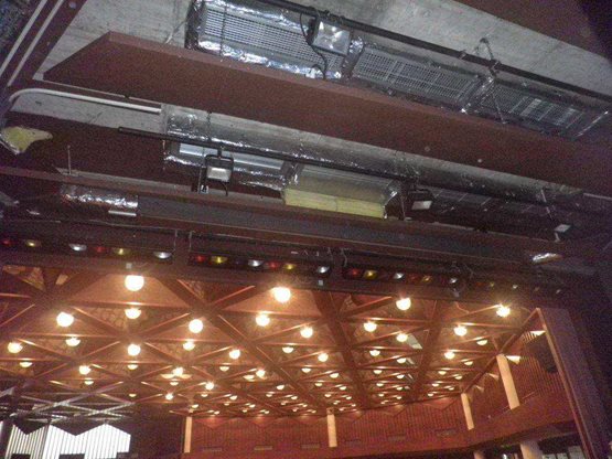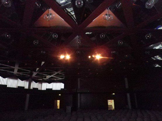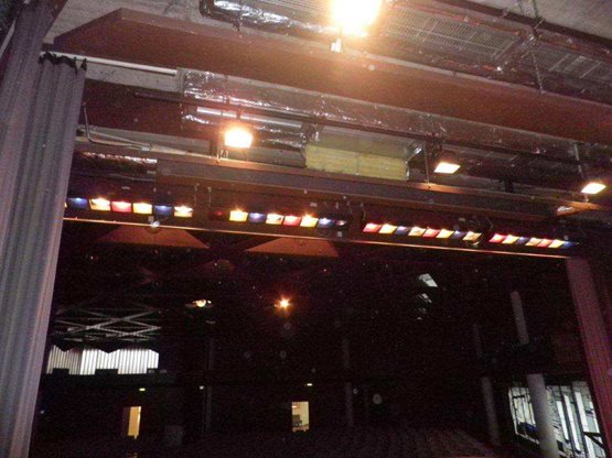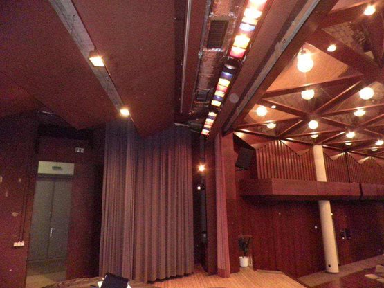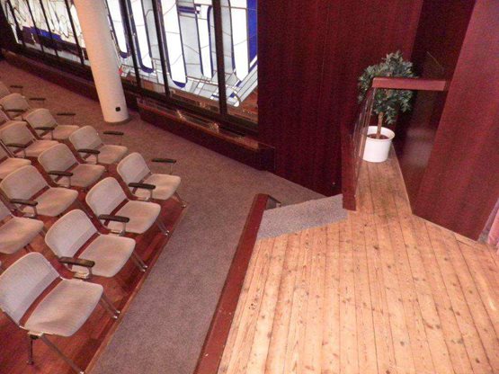 Die Bühne im großen Saal hat eine Höhe von 1 m. Die weiteren Maße betragen 8,50 m x 7,4 m x 5 m. Besonders auffällig ist die Form der Bühne, welche einem Dreieck gleicht.