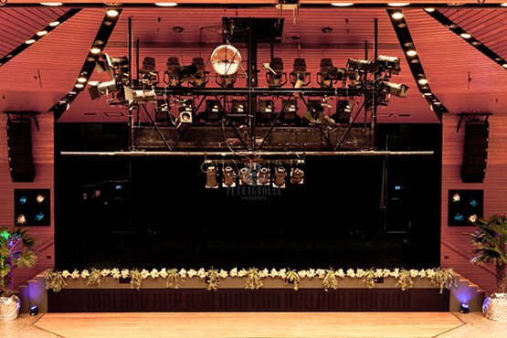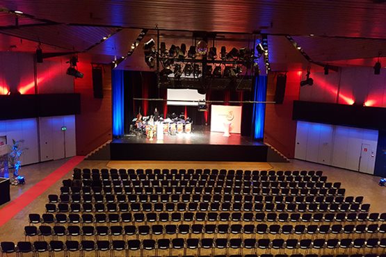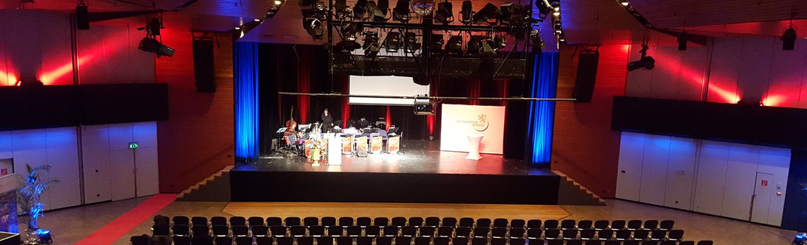 Bei einer Reihen- oder Theaterbestuhlung bietet der große Saal 710 Plätze. Die Reihe 1 bis 10 ist ebenerdig und die Reihe 11 bis 20 befindet sich auf höhenverstellbaren Podesten. So hat man von allen Plätzen eine gute Sicht auf die Bühne.