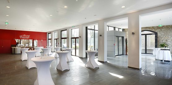 Ideal geeignet ist das Burgcasino für kleinere Hochzeitsfeiern oder andere Familienfeiern. Die Fläche des Raumes ist 275 qm groß und sticht aufgrund seiner modernen Architektur und die festinstallierte Bar heraus.