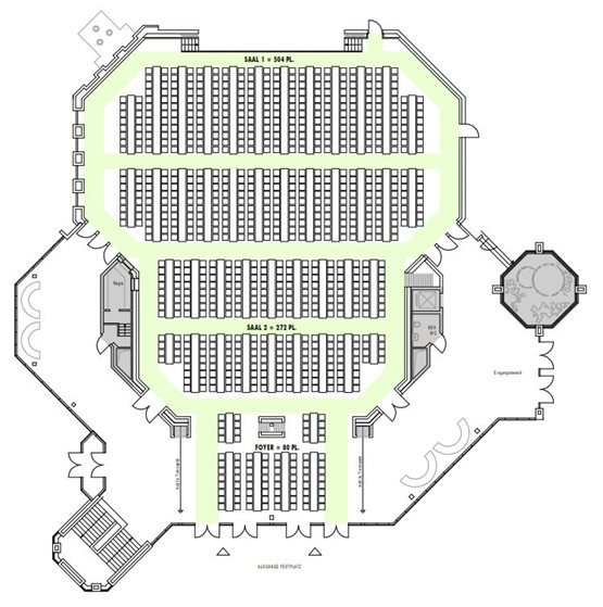 Die Stadthalle Werl besitzt natürlich für solch flexible Räumlichkeiten auch die passenden Bestuhlungsmodelle. Zum einen die klassische Reihenbestuhlung mit einer aufgebauten Kapazität von 924 Personen im Saal. Bei einer Bankettbestuhlung lassen sich mit Einbindung von Restaurant und Gesellschaftsraum 1000 Gäste im Saal unterbringen. Und zu guter Letzt, gibt es natürlich auch einen Bestuhlungsplan für Tagungen. Bei einer Parlamentarischen Bestuhlung lassen sich bis zu 500 Personen zu Ihrer Tagung einladen.