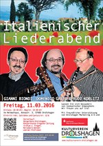 Domenico Greco, bekannt als der “Drolshagener aus der Toskana”, leitet in Pistoia (Toskana) eine Sprachschule und lehrt uns im Winter in Drolshagen und Umgebung die schöne italienische Sprache. Musik ist seine Leidenschaft und dazu laden wir Sie ein! Im Trio mit Gianni Biondi aus der Toskana und Rudi Koblitz aus Drolshagen verwandelt sich der Brunnensaal des Heimathauses wieder in eine toskanische Trattoria. Gianni Biondi ist ein hervorragender Gitarrist und Musiker, der bei den Konzerten in harmonischer weise unterstützt. Der Dritte im Bunde, Rudi Koblitz, ist ein Berufsmusiker im Ruhestand und stellt mit dem Akkordeon oder der Klarinette eine ideale Ergänzung zu seinen Kollegen dar. Der Italienische Liederabend ist ein langjähriger beliebter Klassiker im Programm des Kulturvereins Drolshagen: Ein abendlicher Traum von italienischem Frühling und Sommer im sauerländischen Spätwinter. Lassen Sie sich von den italienischen Klängen zum Mitsummen, Mitklatschen und Mitsingen animieren. Genießen Sie den Abend bei Rot- und Weißwein sowie Cantuccini.