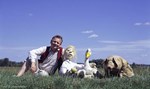 Auf der Wanderschaft ins Glück begegnet er merkwürdigen Zeitgenossen; da ist zum Beispiel der Müller, der Macher, der schafft und schafft, und dann der Reiter, der Vorfahrtsmensch, überall will er der erste sein, der schnellste, da ist der Gänsemensch, der Genussmensch, Komfort Luxus und Mode, die so herrlich weichen Gänsefedern …