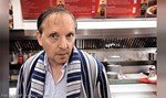 Dittsche im Original-Bademantel, mit Oberhemd, Jogginghose und Schumiletten, eine Flasche Bier in der Hand, eine Alditüte mit Leergut dabei.