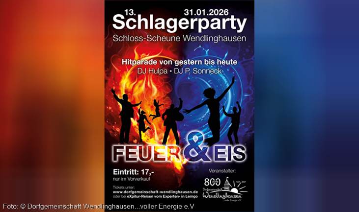 Die Dorfgemeinschaft Wendlinghausen „Voller Energie“ organisiert regelmäßige Veranstaltungen und Events. Beginnend mit der jährlichen Scheunenparty am Schloss & Gut Wendlinghausen starten wir jedes Jahr in unser Vereins Leben. An diesem Abend freuen wir uns auch immer über den Zuspruch außerhalb der Dorfgemeinschaft. Mehre hundert Gäste können wir jedes Jahr an diesem Abend begrüßen. Dieses Jahr feiern wir die Schlagerparty unter dem Motto "Hitparade - Feuer & Eis" bei Schlager der letzten 30 Jahre. Lasst euch überraschen, ihr werdet die Schloss Scheune nicht wiedererkennen.