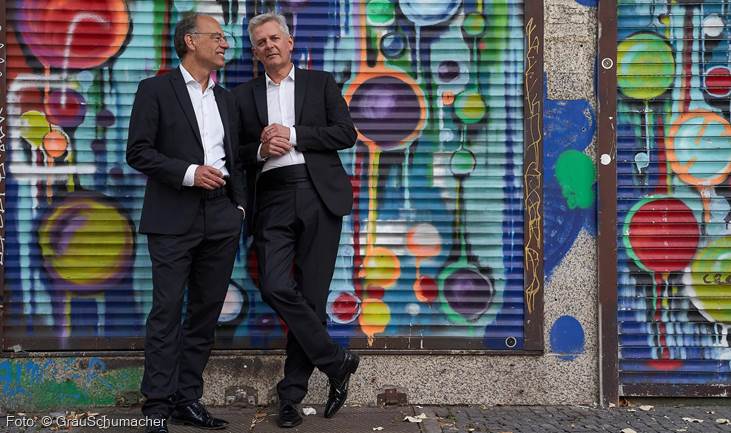 Einige von Ihnen erinnern sich vielleicht noch an die fulminante Uraufführung des Monodramas »Flegeljahre«, das von den Musikfestspielen 2021 in Auftrag gegeben und vom Komponisten Stefan Litwin eigens für dieses Weltklasse-Duo geschrieben wurde. Die beiden Pianisten verkörperten darin die Zwillinge Vult und Walt der Romanvorlage von Jean Paul, und wenn man die beiden am Klavier erlebt, ist man versucht, Andreas Grau und Götz Schumacher tatsächlich als musikalische Zwillinge und Seelenverwandte zu betrachten.